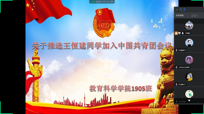 bevictor伟德官网1905班全体同学于2020年5月22日进行了线上会议,会议对推选王恒建同学加入中国共青团进行班级内表决,会议由团支书丁凯瀛主持。