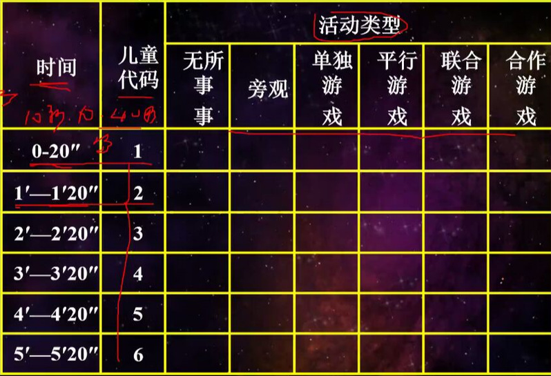 了解完理论部分后,吕老师播放了一段小班幼儿游戏的录像,引导同学们运用时间取样的方法来观察幼儿们的社会性参与水平。之后,又通过对大班儿童A区域游戏中拒绝策略的观察,从“自己”、“游戏”、“他人”这三个角度分析幼儿的心理活动。讲座最后,吕老师介绍了时间取样的三种类型并且详细说明了使用步骤。