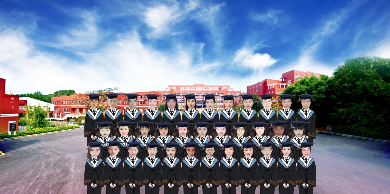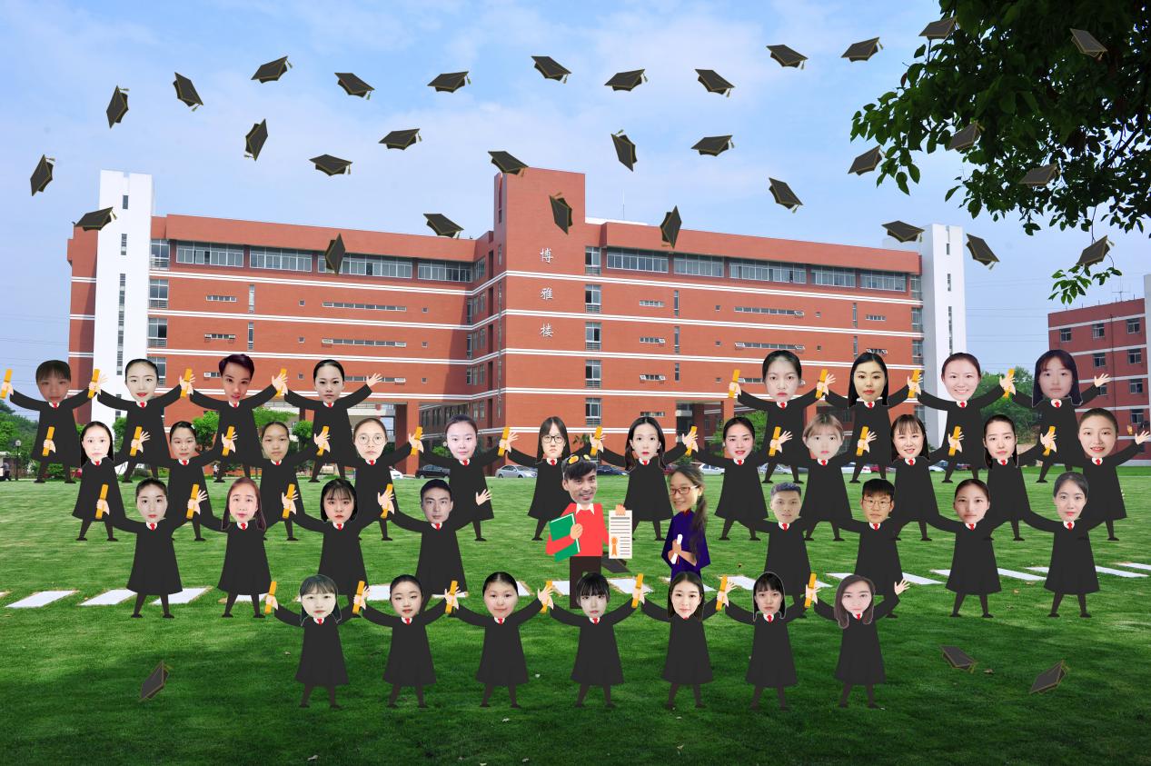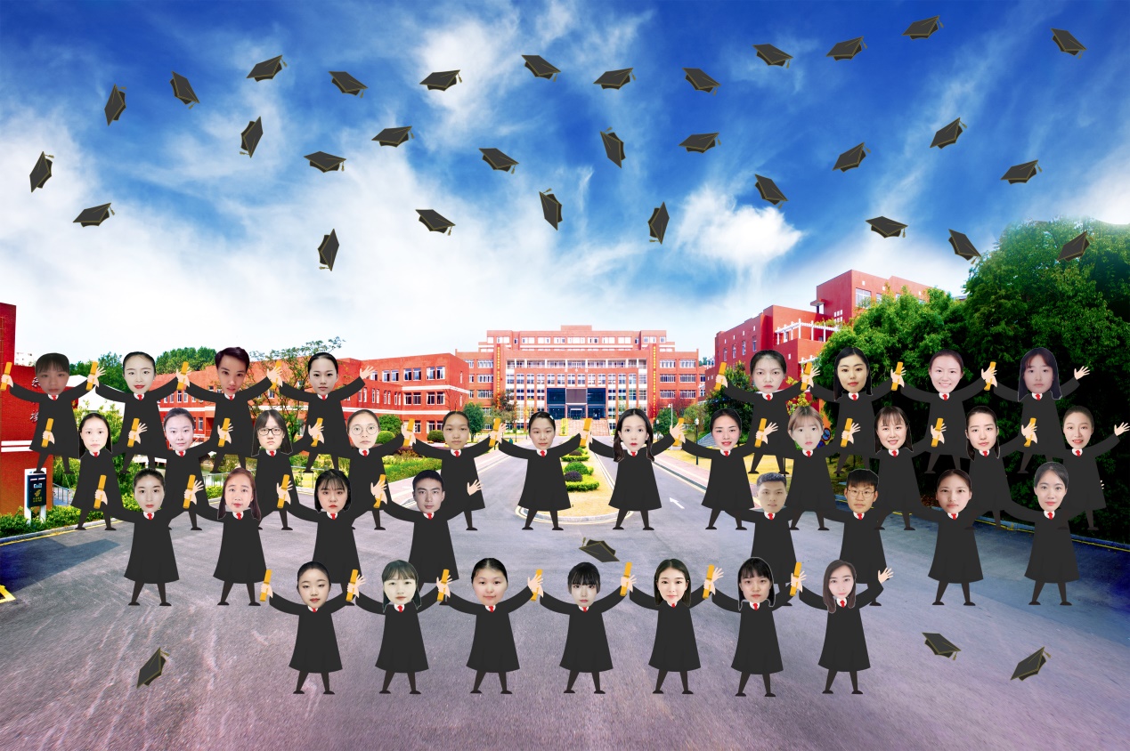 通过线上采集照片,设计毕业服,选取校园场景作为背景,同学们制作了一张张特殊的毕业照。照片中,老师手捧书卷,脸上洋溢着幸福的微笑,毕业学子的学士帽被高高地抛在空中。一张张毕业照既具有喜感又暗含泪点,疫情使同学们分隔异地,但制作出的毕业照是毕业学子心连心的桥梁。