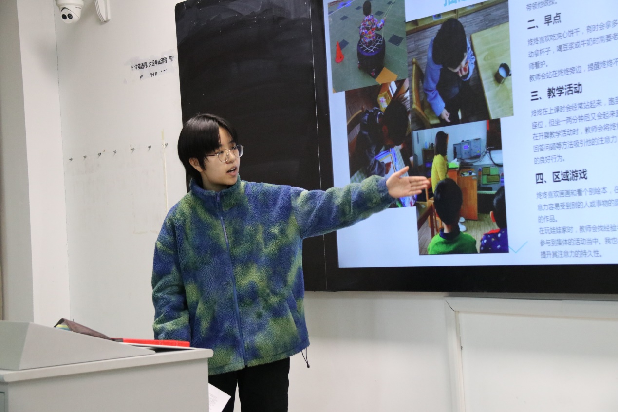 师生互动环节,学前教育专业17级本科实习生和18级见习生团队合作、精心准备PPT,分享了到南京市普通幼儿园、融合幼儿园、康复中心幼儿园和特殊公司与特殊幼儿亲密互动的经历与感受。员工汇报既有认真观察特殊幼儿一日生活的感性描述,也有虚心学习带班教师指导策略的理性思考,更有积极尝试与班上教师合作实施早期干预的有效互动。郭慧琳同学对康复中心的自闭幼儿的个别教育的全过程进行了完整汇报,焦雪昕同学对自闭症幼儿一日生活的过程进行了非常详细地记录和分析,李迪同学将班上教师和资源教师共同为自闭症幼儿干预的过程绘制成图表分享。同学们在走近融合教育实践现场、感受融合教育环境和亲身体验融合教育活动的过程中,树立了为所有幼儿服务、积极投身融合实践的教育情怀,感受了融合校园文化的独特魅力。