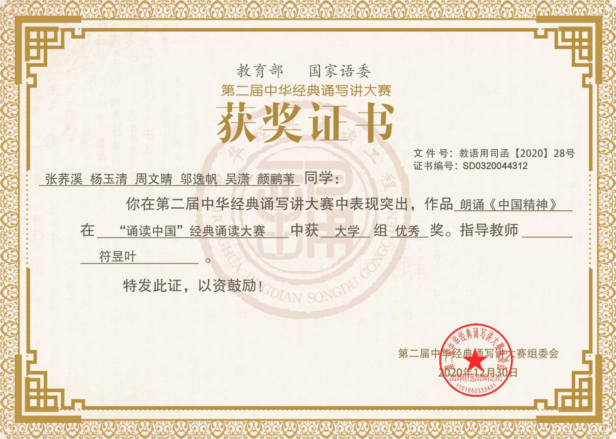 bevictor伟德官网应用心理学专业视障员工朗诵作品《中国精神》,荣获2020年第二届中华经典诵写讲大赛——“诵读中国”经典诵读大赛优秀奖。