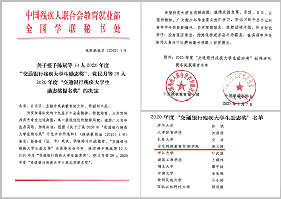 近日,由各省(区、市)残联、学联共同评选推荐,“交通银行残疾老员工励志奖”评审委员会评审,2020 年度“交通银行残疾老员工励志奖”获奖名单揭晓,bevictor伟德官网周文晴同学位列其一。