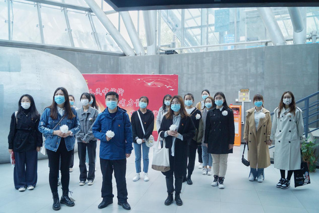 活动伊始,党员老师和同学们胸佩自制的白花,在南京航空烈士纪念馆内缓步参观,认真聆听讲解员对抗战历史的解说。同学们在展品前驻足观赏,解说员为同学们解惑答疑,让同学们加深了对中国空军抗击侵华日军英雄事迹的认识和了解。通过倾听空军抗战期间一桩桩伟大事迹、观看一件件仿真的战机模型,同学们心中燃起了对航空英烈们的敬仰之情,抗战精神和奋斗精神也在心中生根发芽。活动的最后,老师与同学们手持党旗站在抗日航空烈士纪念碑前合影留念,并在英烈们的见证之下重温入党誓词,坚定理想信念。