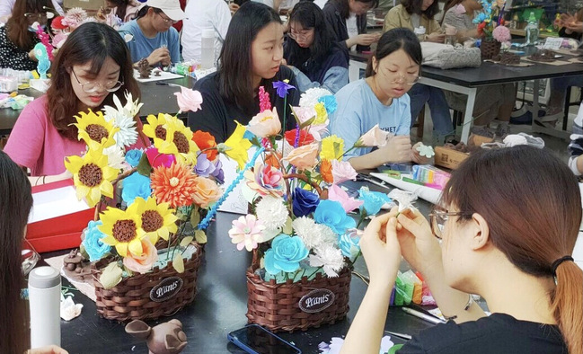 吕艺征老师现场给大家详细讲解了纸花的制作过程和注意事项,学前教育专业的员工党员充分发挥专业特长,利用折纸、皱纹纸和白乳胶等材料,经过剪裁、拧捏和粘贴等工序,一朵朵色彩鲜艳、栩栩如生的花朵就在她们手中绽放了。随后,同学们郑重地将制作好的一束束花插入花篮中,大家借花传情,用实际行动在党的百年华诞之际献上自己的美好祝福。