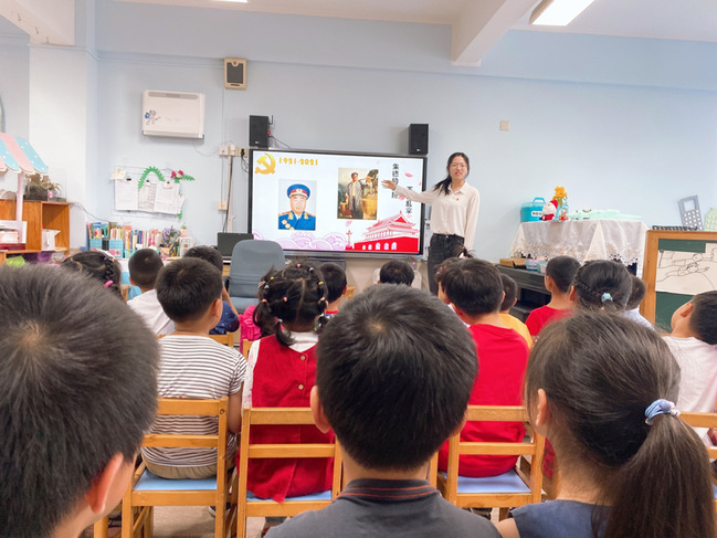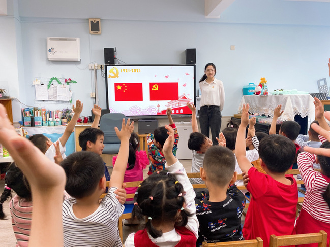 员工党员吴琪哲毕业后即将前往杭州市白马湖实验幼儿园工作,成为一名光荣的幼儿教师,在实习期间,她抓住此次“传承红色基因、讲好党史故事”实践活动机会,为班上幼儿上了一节别开生面的微党课。她首先请小朋友们观察挂在墙上的国旗,在小朋友们充分观察讨论之后又拿出了中国共产党的党旗,对比他们的异同。然后告诉孩子们,党旗是中国共产党的象征和标志。党徽上有金黄色的镰刀和锤头,红色象征革命,金黄色象征光明,锤头、镰刀是工人和农民的劳动工具,代表了像我们一样的普通人。吴琪哲更是深入浅出为小朋友讲解了中国共产党的诞生故事,小朋友们被深深感染,纷纷说以后要到上海看看中国共产党的诞生地。