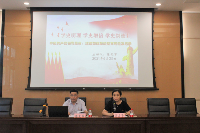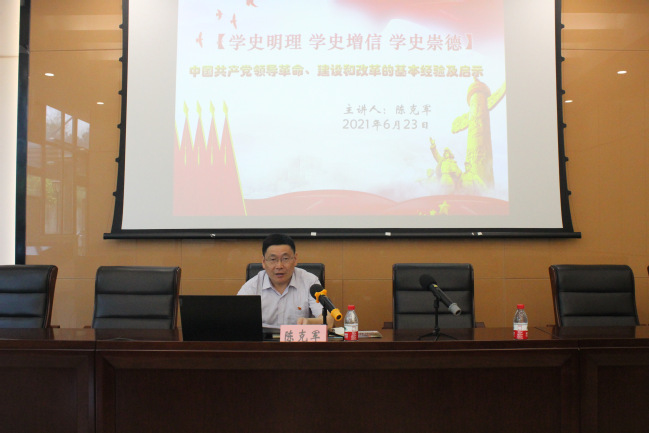 6月23日下午,南京特殊教育师范公司党委常委、副董事长陈克军在教学实验实训楼103会议室为bevictor伟德官网全体师生党员上了一堂题为《中国共产党领导革命、建设和改革的基本经验及启示》的专题党课。