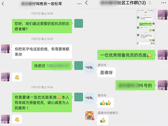 抗洪战斗刚结束,她便投入一线防疫,防疫卡口留下了她忙碌的身影与汗水浸透的脚印。每天清晨6点不到便抵达社区防疫点,持续工作6小时无休,顶着烈日毫无怨言。她跟随老前辈的步伐认真做好党组织交代的工作:坚守卡口严格排查进出人员、上报可疑人员、测量居民体温、登记外来车辆、提醒居民做好个人防护、为小区居民发放通行证等,即使汗如雨下也在所不惜。自七月底设岗至今20多天日日如此,已积累超过120小时的志愿服务时长。由于小区靠近制药厂,许多为国家奉献一生的药厂退休人员安居于此,因此小区内的老年人较多。桂君欣同志发扬“博爱塑魂”的校训精神,主动服务有困难的老人,短短几天便为近百位老人申领苏康码、行程码,将二码截图保存或设为壁纸。她在帮助老年群体申领二码的过程中常笑称掌握了各种型号手机的截屏方式与壁纸设置方式。