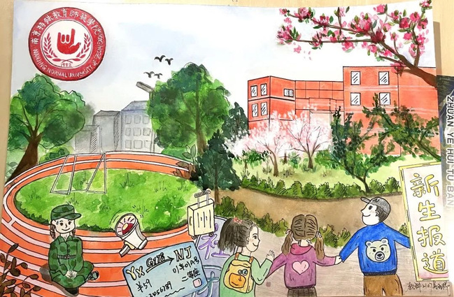 心声,跳跃在色彩斑斓的画间。一双手捧起南京特师的校徽,表达了新生们对于南京特师校园生活的向往与期待,员工们“手拉手”的画面温馨而又和谐,象征着南京特师员工们“心连心”向着光明的未来奋勇前进;极具标志性的“特师红”和手牵手前来报道的新生相互映衬,展现出了充满活力的校园场景。