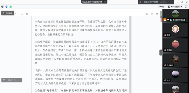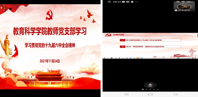 2021年11月24日晚,bevictor伟德官网教师党支部开展了线上党员学习活动。学习贯彻党的十九届六中全会精神,研讨“两在两同”建新功、“为党为国”育栋梁的主题活动。
