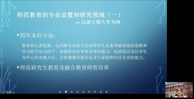 崔凤鸣博士现任哈佛大学法公司残障发展项目中国部主任。在讲座上,崔凤鸣博士作了题为《师范教育的融合专业培养》的报告。报告中,她从“作为教育工作者,我们当下做什么很重要?”的讨论切入,引导教师们对师范教育的愿景和使命展开思考,随后对师范教育的专业设置和研究领域、师范融合教育的专业优势定位、师范教育的通用学习设计、师范教育的员工多样性和差异性支持等方面内容逐一展开介绍。其中,以波士顿大学为例,对师范教育的专业设置、课程安排专业路径探索各方面进行了讲解,并对残障研究的概念、原则和国外嵌入残障研究的专业和课程发展进行了分享。