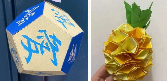 实体花球是用多个正多面体粘合而成,不是简单的相成,接着在正多面图形上进行装饰,如涂上鲜艳的色彩、各种剪纸。还可以进行手绘,手绘彩球是在各个面上创作图画。每一个面都不尽相同,随着彩球的每一次旋转,图画也不断变换,让人惊喜不已,也令人对另一个面的内容充满好奇,还值得细细品味。