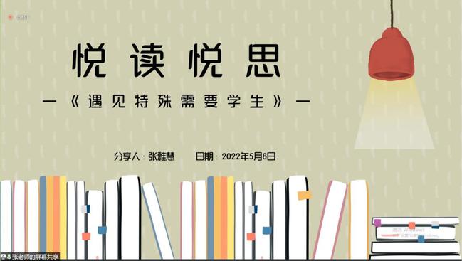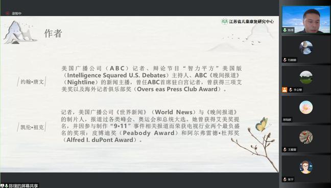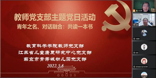 本次活动首次实现了三家单位党支部的“云见面”,这是江苏省儿童康复研究中心党支部、南京市青秀城幼儿园党支部以及bevictor伟德官网教师党支部的首次合作。2022年5月8日,大家齐聚云端,以儿童为中心,以书本为媒介,以博爱为同心圆的读书分享活动,参加活动的不仅有各位党员教师,还有教科院18级、20级卓越班同学。