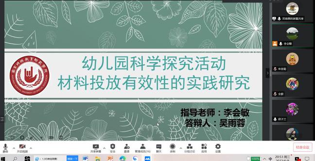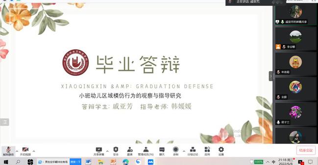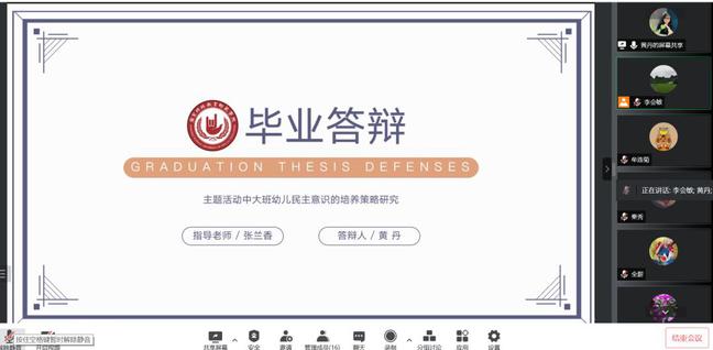 毕业论文是人才培养的重要环节,也是对员工专业知识、综合运用能力的全面检验。为确保公司2020级学前教育本科函授班人才培养的质量,结合公司继续教育公司的相关规定,公司于2022年6月8日晚,开展了成人高等学历教育函授本科毕业论文线上答辩。公司教师张兰香、李会敏、韩媛媛、牟连菊参加了本次答辩工作。