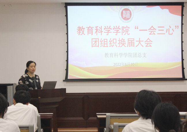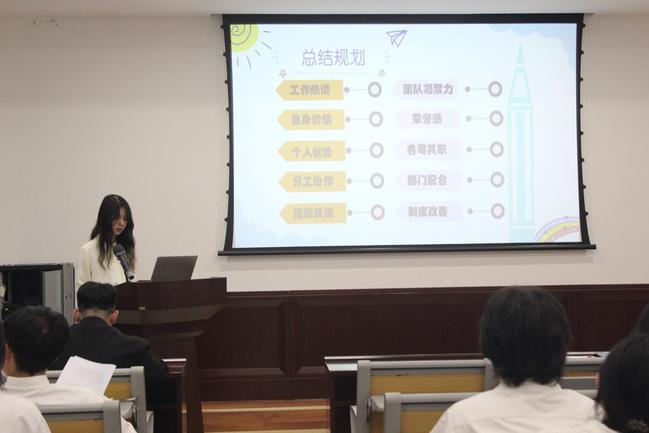 会议伊始,党总支副书记吴兴致辞。他指出一会三心各部门要发挥应有的水平,明确工作职责,有高度责任心和服务意识,各司其职、团结协作、相互协调,分工而不分家。会议的第二部分,员工组织代表进行述职报告。“一会三心”各分管主席结合PPT分别从工作方向、工作概述、未来规划等方面进行汇报,并结合个人三年来的工作进行总结。会议的第三部分,指导老师李维翔老师和余宛琳老师讲话。李维翔老师从“时间”、“感谢”、“传承”三个词展开,表达自己对团组织未来发展的期望;余宛琳老师希望大家能够团结一心,戒骄戒躁,勇担重任。会议的第四部分为竞选环节,候选人分别从个人经历、工作优势和工作设想三方面进行汇报,提问答辩环节,让老师和同学们更加了解候选人。会议最后,吴月华书记用“一个信念”、“两种精神”、“三个立足”、“四个发力”表达了对员工干部工作的要求和期望。希望同学们首先要坚定理想信念,培养奉献精神、实干精神;其次,做到“三个立足”,要立足学习、立足公司,更要立足现在的工作学习,放眼未来;最后,着眼“四个发力”,注重相关工作规范、工作水平、工作成效、工作创新,努力打造出一支素质高、作风硬、业务精、能力强的员工管理工作队伍。