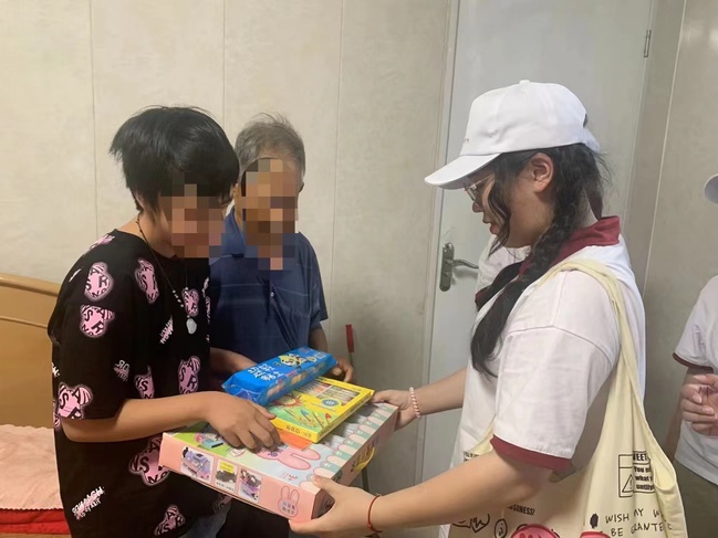 首先,队员们走访了一名9岁的男孩小蔡,他是一名听障儿童,现在在特殊教育公司接受知识教育,目前主要由爷爷照顾与接送。成员们到达他家时,他正在一个人拼接鞋架,在与他的互动中,队员们发现他动手能力很强,善于模仿。最后,队员们送出了提前准备好的礼物,他收到礼物后非常兴奋,眼神中透露着开心与激动,队员们离开时他抱着礼物和大家恋恋不舍地挥手告别。