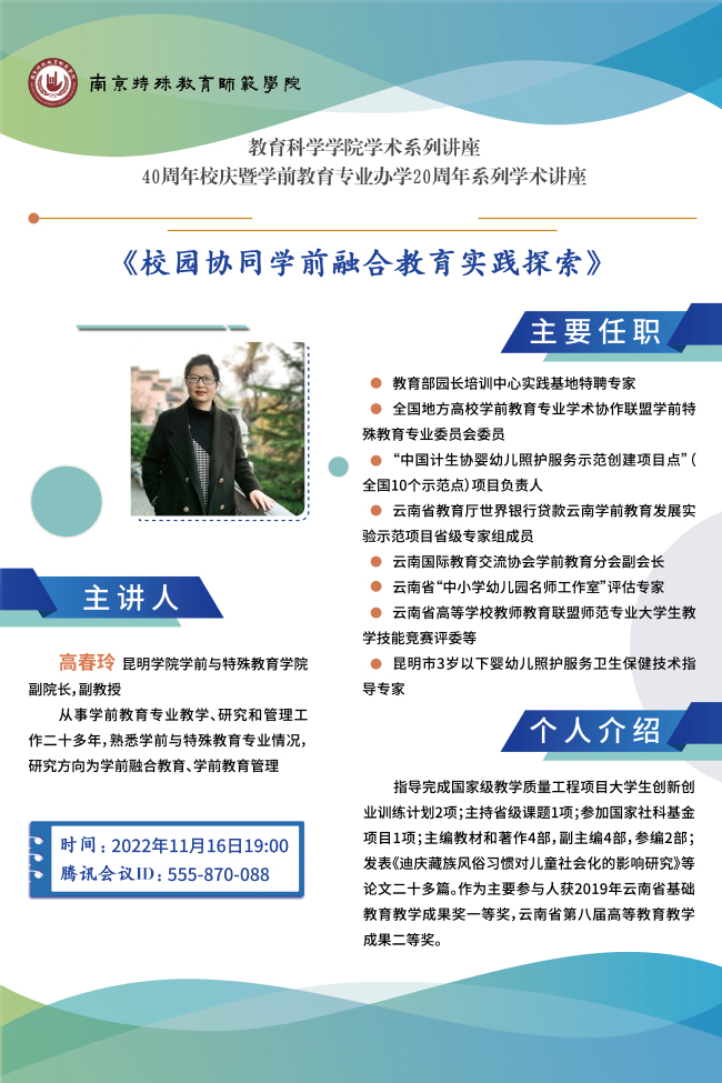 【学术讲座】11月16日高春玲《校园协同学前融合教育实践探索》