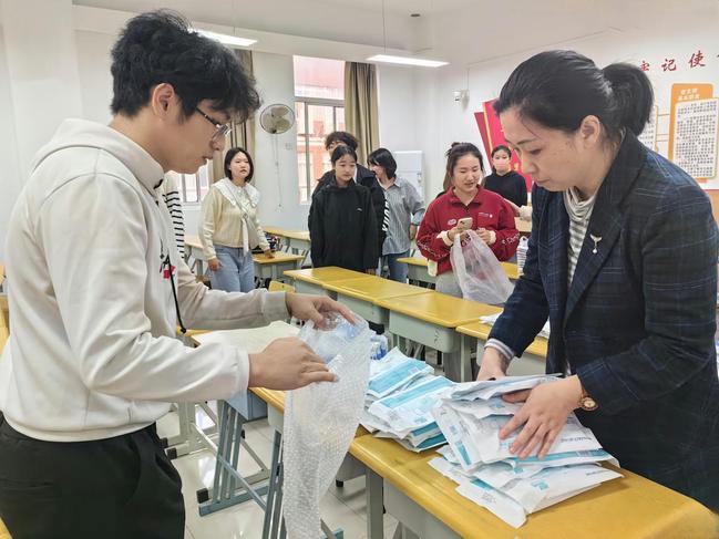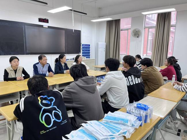 活动伊始,刘新学经理和吴月华书记与员工开展面对面交流,亲切询问同学们的学习和生活状况,了解同学们平时遇到的困难,并提出解决途径和方法。刘新学经理指出,大家要做好认知管理,做好自我优势的剖析,提前做好职业规划,在校时认真学习专业知识和提高技能素养,不断提升自我竞争力,为未来发展打下基础。吴月华书记强调了今年正值公司四十周年校庆和本科评估的关键时刻,大家要抓住学风建设不放松,班委要起好带头作用,带领班级同学共同进步。同时,老师嘱咐同学们,疫情还没有完全消退,依然要绷紧一根弦不放松,扎实做好疫情防护工作,要坚持每天在规定的时间内进行疫情体温填报,百分之百完成全员或者抽样核酸检测任务,及时发现问题、解决问题,并寻求帮助。各班在认真督促同学们做好疫情防控各项工作的同时,也要时刻关注同学们的身心健康,积极为同学们做好心理疏导工作,帮助同学们解决生活难题。活动最后,老师们一起为同学们分发口罩、酒精棉片等防疫物资,将这份爱心和温暖传递到每一个班、每一位同学的心中。