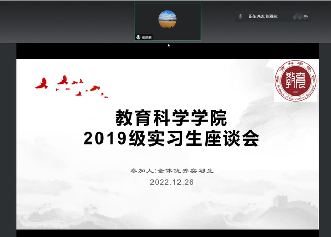 在会议伊始,张丽莉老师首先对此次实习进行总体情况概述:疫情为实习工作的展开造成了一定困难,但与此同时也让实习生们更加突破自我,收获良多。接着,参会员工有序发言,讲述自身实习经历,交流心得经验。在会议过程中,个别实习生由于身体不适不能语音发言,也坚持在聊天区进行了文字交流。由此观之,实习工作给每位实习生都留下了深刻印象。幼儿园小朋友的乖巧懂事、带班老师全面而细致的经验传授都使得实习工作顺利开展。此外,在实习过程中,大家也遇到了不同程度的困难——各种活动的时间冲突,特殊儿童的合理配置及照料,还有个别幼儿园的特殊性,如需要实习生用英语交流等,增加了实习过程的难度。然而,也正是这些大大小小的困难,使得实习生们逐步收获了书本以外的实践知识,深刻体会到现实中的教育工作需要教师掌握更多技能。临近座谈会结尾,张丽莉老师对此次实习工作进行总结,并对同学们提出殷切期望。