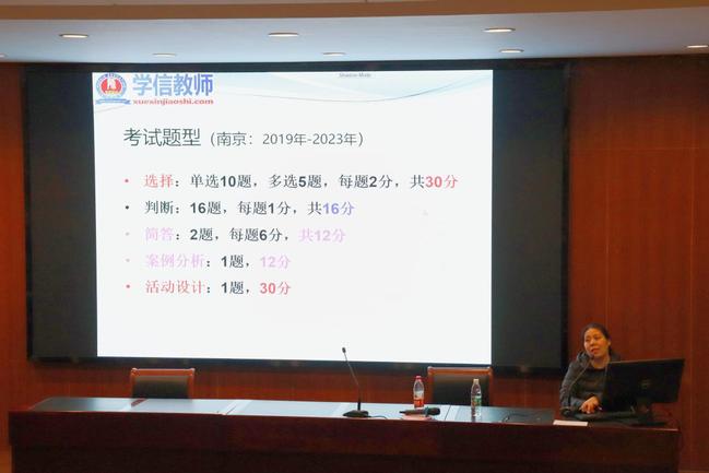 讲座开始,徐老师为同学们详细介绍了编制、备案制、年金制等不同制度的优缺点,帮助同学们了解不同岗位的区别,清楚就业方向和目标。紧接着,老师强调要去学会阅读招聘公告,并带领大家共同阅读了一篇公告,她用红色字体标注出公告重点帮助同学们更好理解,并为同学们解读了江苏各地教育局教师招考最新政策。之后,赵老师为同学们全面地介绍了考试大纲,具体分析了考试重难点及各地试题的异同,为同学们做了周密而又详尽的考试指南,并带领同学们共同分析了可能迎考的知识点和题型,提高了同学们对编制考试的认识。