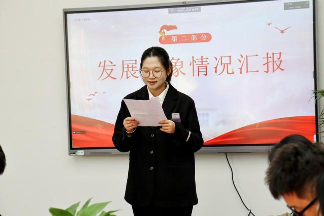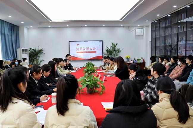 会议伊始,由员工第二党支部书记江敏老师报告出席会议的党员人数,提出会议议题以及要求。会上,发展对象边玉佳、董一泽等十一位同学逐一进行个人情况汇报,表明入党动机、对党认识以及汇报入学以来的个人表现。同学们真诚地表达了自己对加入党组织的愿望和对党的忠诚,表明了为共产主义事业而努力奋斗的决心。紧接着,入党介绍人介绍发展对象的基本情况,并且根据他们的在校表现和道德品质对其能否入党表明意见,随后支部委员会报告发展对象的审查情况。正式党员以无记名投票的方式进行表决,通过后的发展对象正式成为了预备党员。最后,由胡芳老师讲话,她首先祝贺新接收的十一位预备党员,并感谢各位预备党员的入党介绍人对党员们的辛勤培养。同时对新接收的十一位预备党员做几点要求:一、要珍惜党员荣誉,今后要时刻以党员的标准严格要求自己,不忘初心、牢记使命。二、要加强政治理论学习,坚定理想信念,特别要学习党的二十大精神和习近平总书记的系列重要讲话,时刻履行党员义务,积极参加党组织活动。三、要时刻铭记自己的党员身份,树立正能量,引领正风气,注重个人言行举止,发挥党员先锋模范作用,真正做到思想上入党,行动上入党。