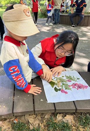 活动的第一个环节——“植物拓印”,志愿者帮助孩子粘贴植物,引导小朋友们更好地使用工具完成植物拓印,完成拓印的小朋友们相互欣赏对方的作品,并简单交流了画面布局和设计思路,这个环节激起了孩子们的探索欲,同时让孩子们领悟了大自然的神奇。