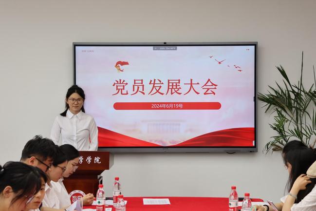 会议伊始,参会全体成员以饱满的热情唱响国际歌。会上,11名发展对象依次就自己一年以来的表现进行思想汇报,重点汇报了个人基本情况、入党动机、对党的认识等,同学们恳切地表达了对党的忠诚和加入党的决心,表明了为共产主义事业奋斗终生的决心。在每位发展对象思想汇报结束后,入党介绍人对其学习、工作、实践活动等方面进行客观评价,并对其能否入党表明意见。