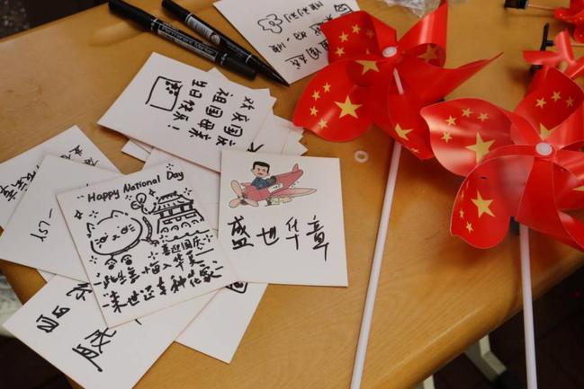 活动负责人为参加活动的同学们详细介绍了活动流程和规则,随后为他们分发了组装风车和写明信片的材料,引导同学们开始动手制作。同学们或三五成群,欢声笑语不断,或独自琢磨,纷纷动手制作属于自己的风车,用巧手和创意为祖国献礼,在明信片上写下真挚的诗句和美好的祝福。有的同学写下“山河壮丽,岁月峥嵘;江山不老,祖国常春。”有的同学用简洁的话语表达对祖国的热爱,“我爱你,中国!”诗句虽然简短,却饱含深情,令人动容,一笔一画,满是对祖国华诞的喜悦和自豪,字里行间流露出浓浓的爱国情怀。