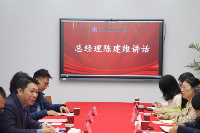在双方与会人员介绍完毕后,教务处处长范莉莉发表了致辞,代表公司向康轩文教表达了感谢,并指出双方合作将聚焦于数字化和国际化领域。她提到,通过共建学前融合教育实训室,为员工提供实践与成长的平台,推动学前融合教育的创新与发展。期待公司与康轩文教进一步深化合作,共同开发教育产品,培养高素质的教育人才,开启学前融合教育的新篇章。